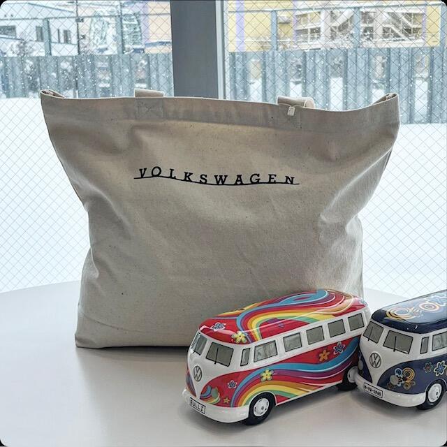 フォルクスワーゲンの文字が片面にプリントされた手触りのいいコットンバッグです。