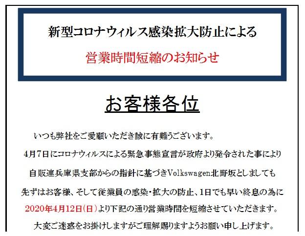 2020年4月12日(日)より下記の通り営業時間を短縮させていただきます。