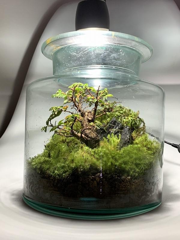 以前から狙っていた、ニレケヤキというミニ盆栽をテラリウム内のシンボルツリーに任命しました。