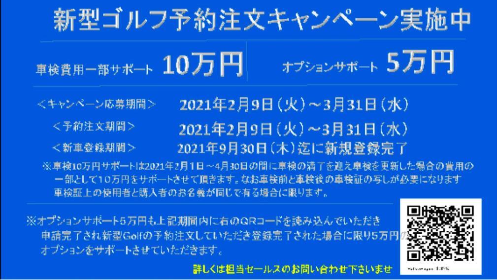 いつもVolkswagenをご愛顧いただき誠に有難うございます。 2月9日に待望のGolf8のご予約がスタートしました。 3月31日までのご予約特典で5万円オプションサポート、2?4月の車検満了のお客様には車検受けの一部として 10万円サポート(VW車以外でもOK)がございます。 是非エントリー宜しくお願い致します。 詳細につきましてはスタッフまでお気軽にお問合せ下さいませ。