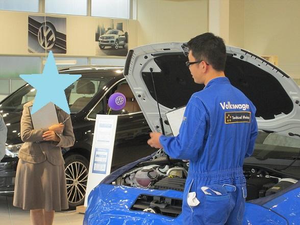 さて、まず一枚目の画像は テクニシャンの青木によるお車を使ってのメンテのご説明 知っておくと便利なちょっとした技なども織り交ぜて 皆様真剣に聞いて下さいました