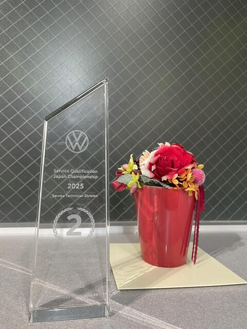 年に一度、国内販売店のサービスアドバイザー・テクニシャンの技術を競うコンテスト サービス クオリフィケーション ジャパン チャンピオンシップ(SQJC)が開催されるのですが 当店のテクニシャンが全国2位に輝きましたー こんな素敵なトロフィーをいただいて帰ってきましたよ 第一次・二次試験は店舗にてオンライン実施、決勝は豊橋にて3種類の競技を行い 約1,200名のサービステクニシャンの頂点を目指し日頃の努力を発揮してきました ちなみに、当店には世界一のテクニシャンもおります そんな技術力の高いVolkswagen松戸ルート6をぜひご利用くださいませ