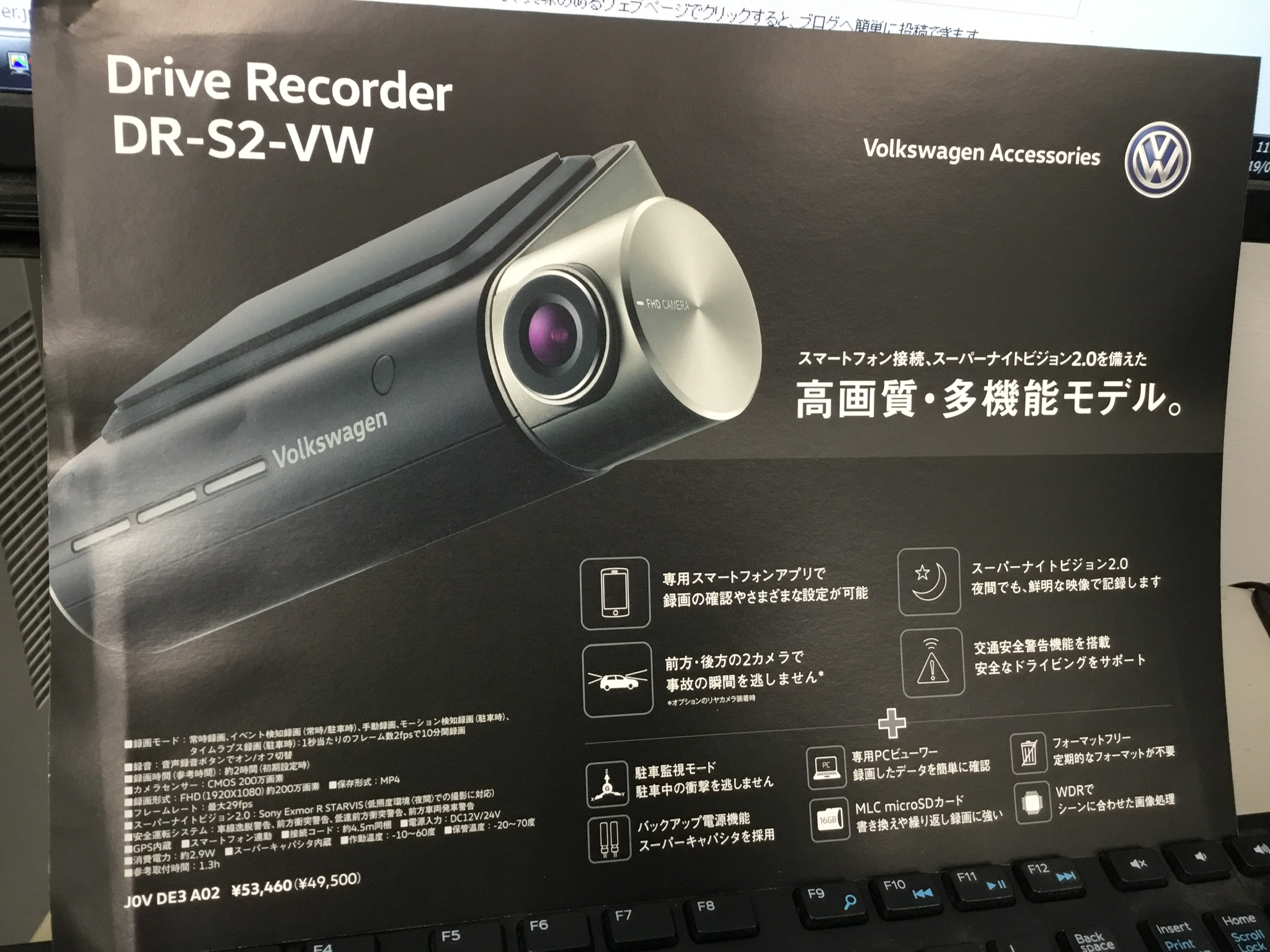 Volkswagen純正のドライブレコーダー(DR-S2?VW)は駐車監視モード、フォーマットフリー(定期的なフォーマット不要)、スーパーナイトビジョン2.0、専用スマートフォンアプリでドライブレコーダーの設定変更や録画された映像をスマホにダウンロードしたり、とても便利で、製品保証も3年ですのでオススメです。