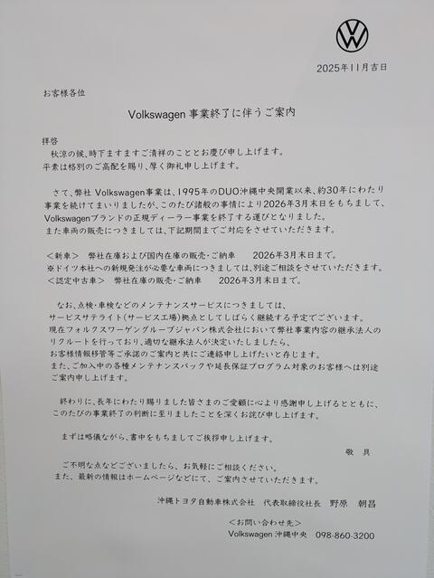 この度、フォルクスワーゲン沖縄中央は2026年3月末日をもちまして、Volkswagen正規ディーラー事業を終了する運びとなりました。