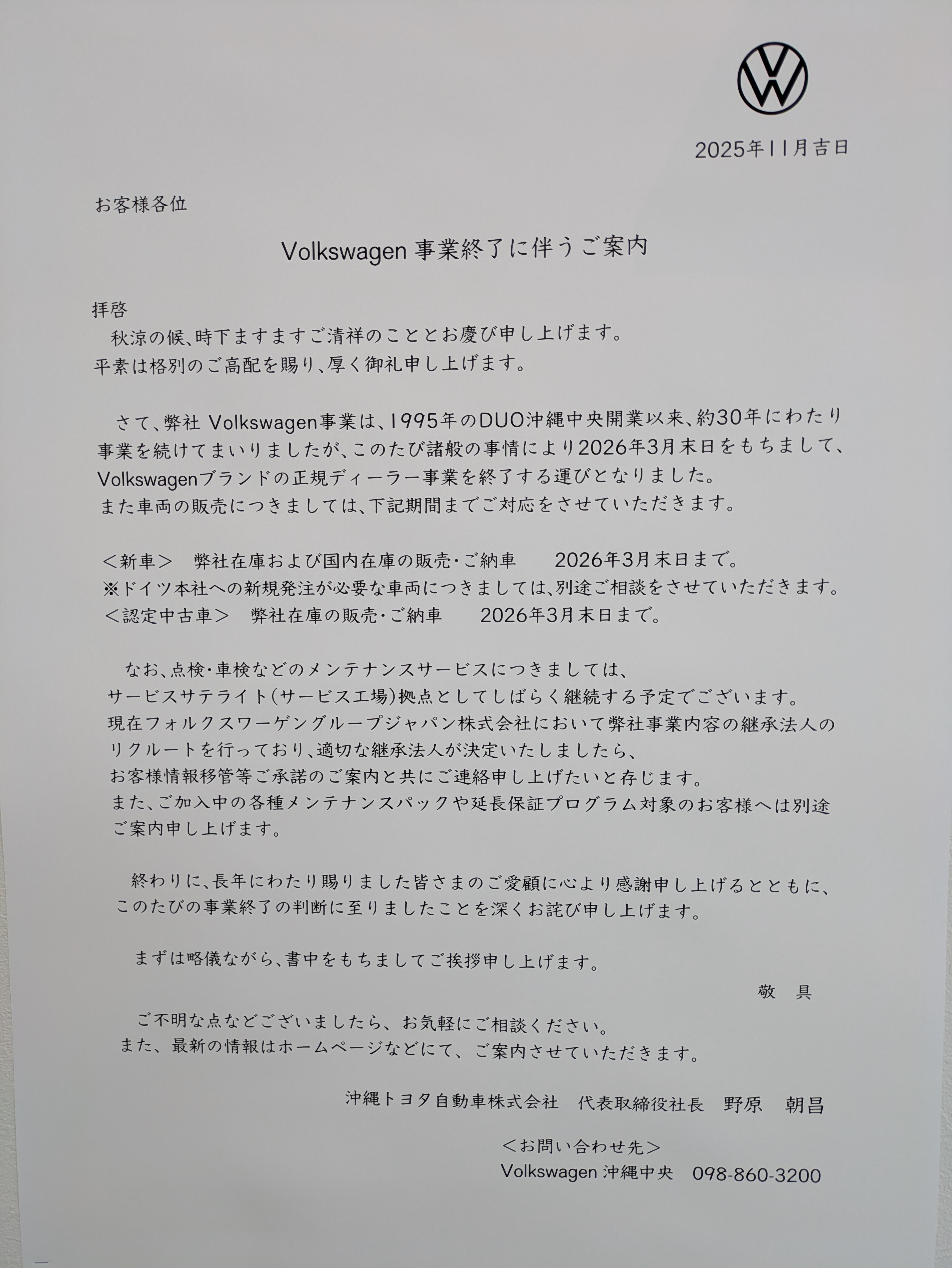 この度、フォルクスワーゲン沖縄中央は2026年3月末日をもちまして、Volkswagen正規ディーラー事業を終了する運びとなりました。