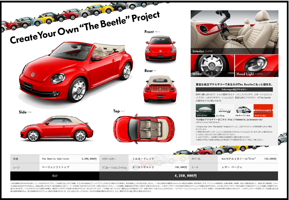 好きなボディカラー×ルーフ×シート内装×ホイール×デコレーションフィルムを選んで、自分だけのThe Beetleを作って実現させることができるんですよ![]()