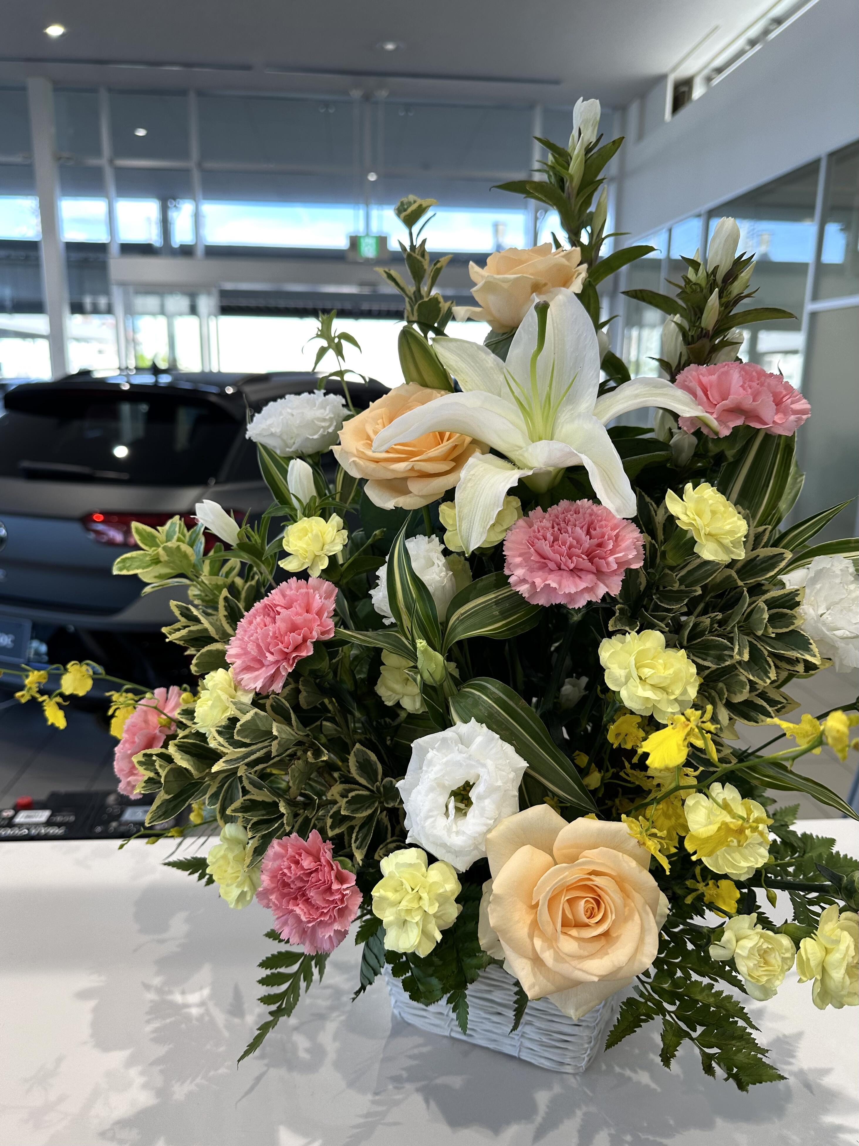 大ぶりの胡蝶蘭と珍しいオレンジの薔薇が目に入る