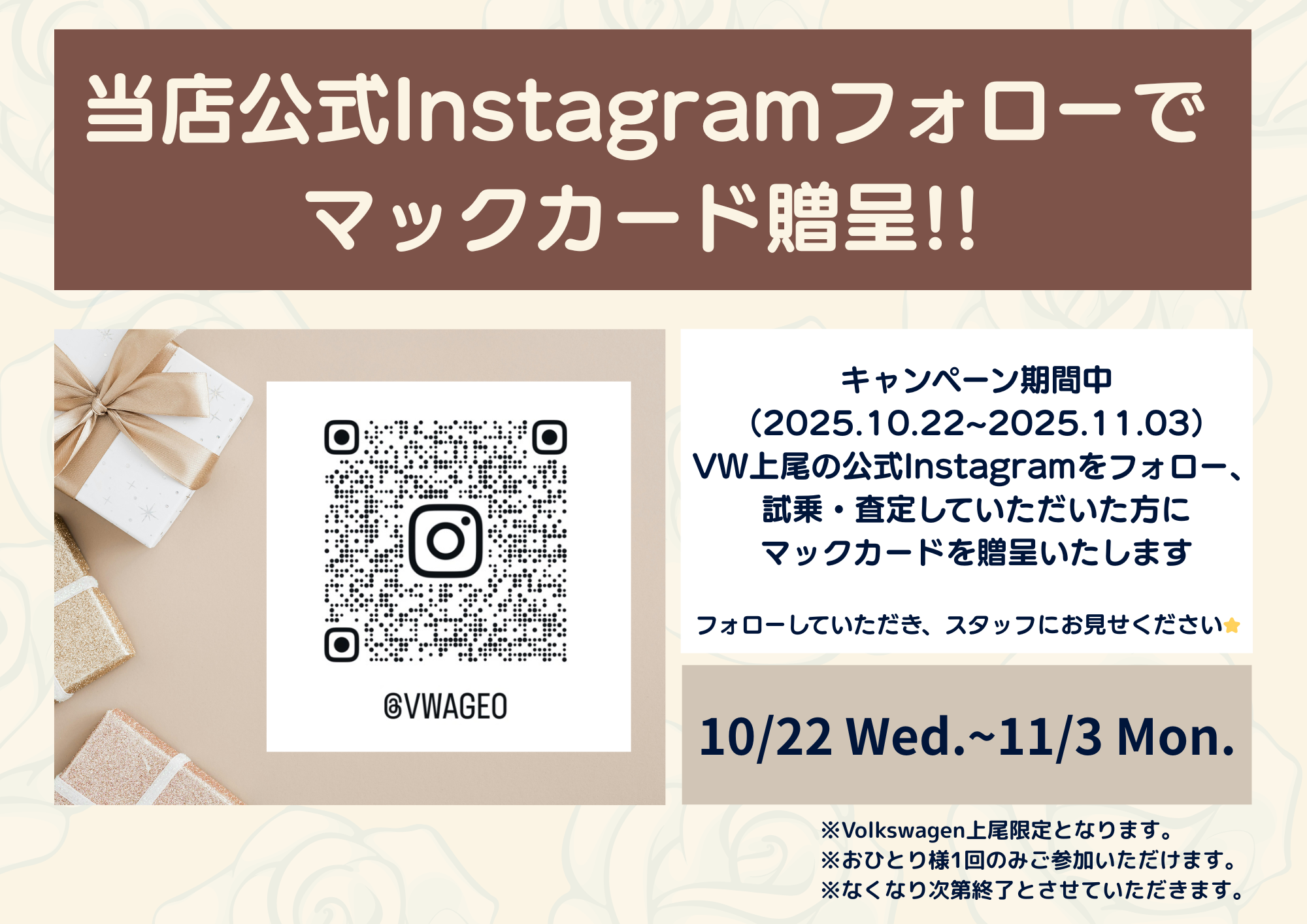 ただいまVW上尾では 【Instagramフォローキャンペーン】 開催中です