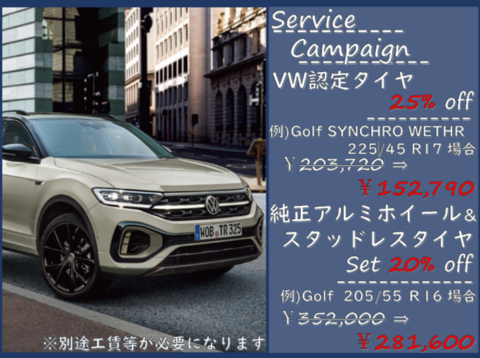 こんにちは! いつもVW千葉北のブログをご覧いただき誠にありがとございます 本日は、10月からのサービスキャンペーンのお知らせです ーーーーーーーーーーーーーーーーーーーーーーーーーーーーーーー★ VW認定タイヤ25%OFF (Golf 17インチの場合) ¥203.720 ⇒ ¥152.790 純正アルミホイール&スタッドレスタイヤ Set 20%OFF (Golf 16インチの場合) ¥352.000 ⇒ ¥281.600 別途で工賃等が必要となりますので、 詳しくはスタッフまでお問合せ下さい 12月末までのキャンペーンとなっておりますので、 この機会にご来店くださいませ(=^・・^=)