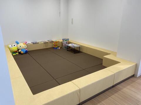 1つ目が、キッズスペースです。ウレタンマットの上でお子様が、塗り絵をされたり、絵本を読まれたり、おもちゃやブロックなどで遊んでいただけるスペースです!