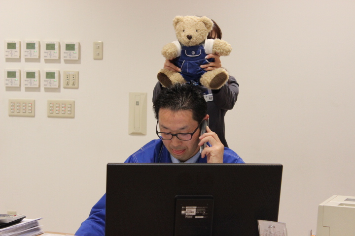 (辰島さんにカメラを向けてみたところ、高山さんの後ろに隠れたんですが、それでも隠れきれなかったらしく、更に頭の上にマイスターベアを置かれるかわいそうな高山リーダー)