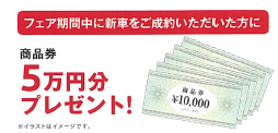 さらに! 期間中新車をご成約で商品券5万円分も プレゼント致します!