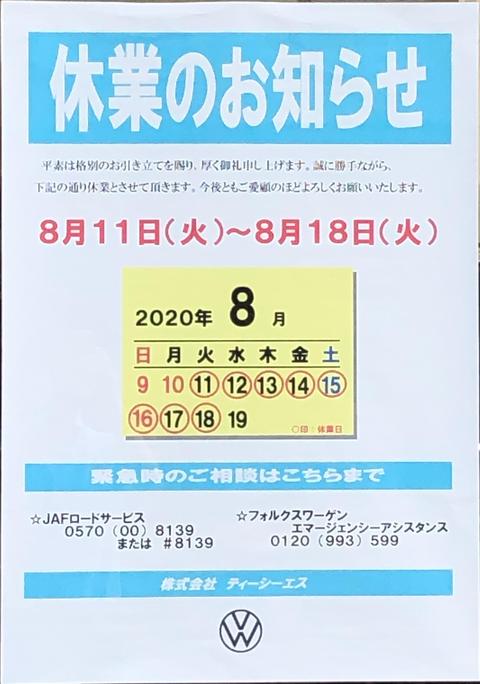 夏休みのお知らせです。 誠に勝手ではございますが8月11日(火)から18日(火)まで店舗定休日とさせていただきます。 期間中の故障、事故トラブルは *フォルクスワーゲン エマージェンシーアシスタンス 0120993599 *JAFロードサービス 0570008139 上記へご連絡をお願いします。 なお、8月19日(水)は朝10:00より通常営業となります。 今後とも変わらぬご愛顧のほど宜しくお願い致します。