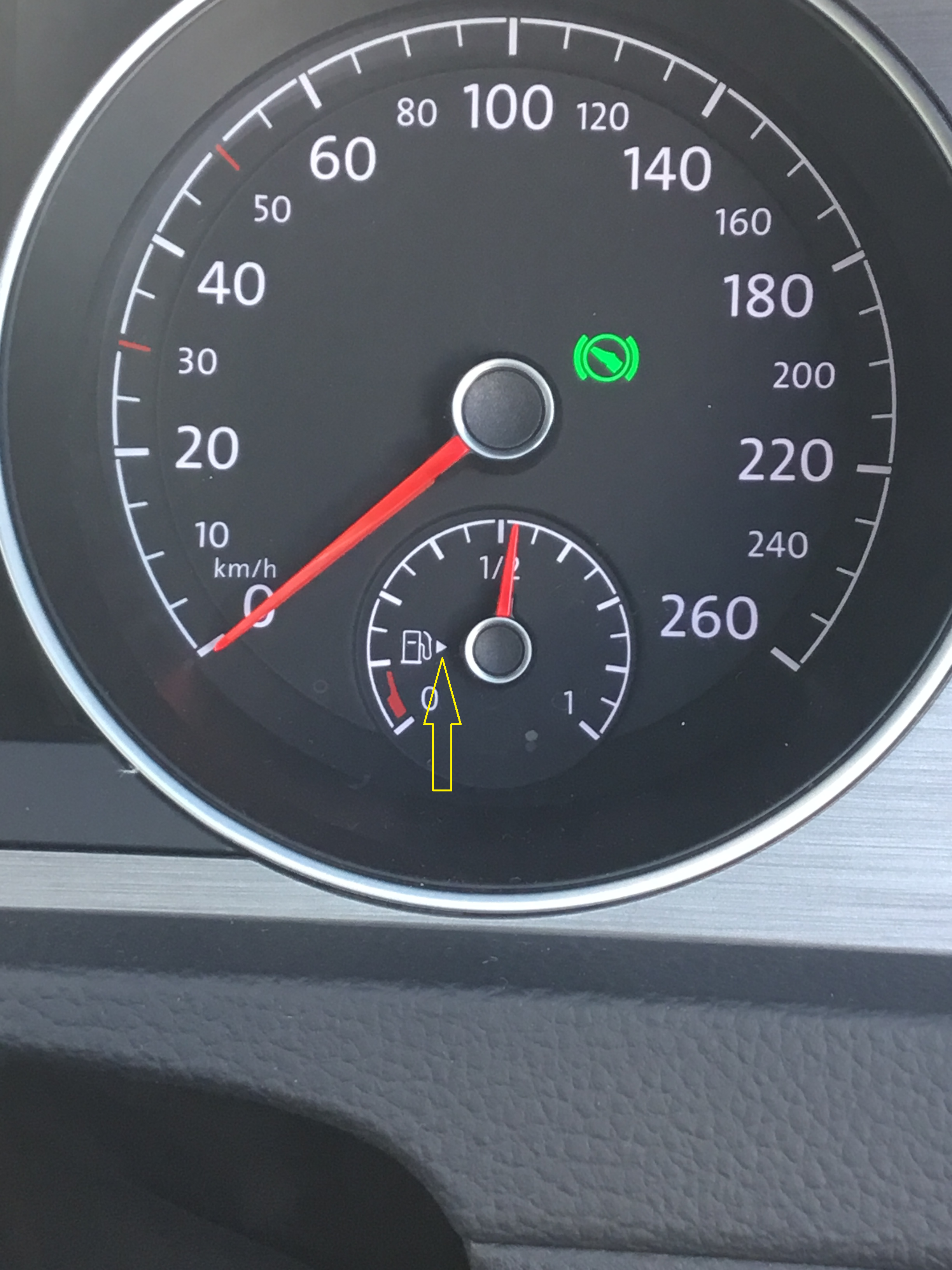 画像はゴルフ7のメーターですが、黄色矢印で示した【小さな三角マーク】で確認できます。