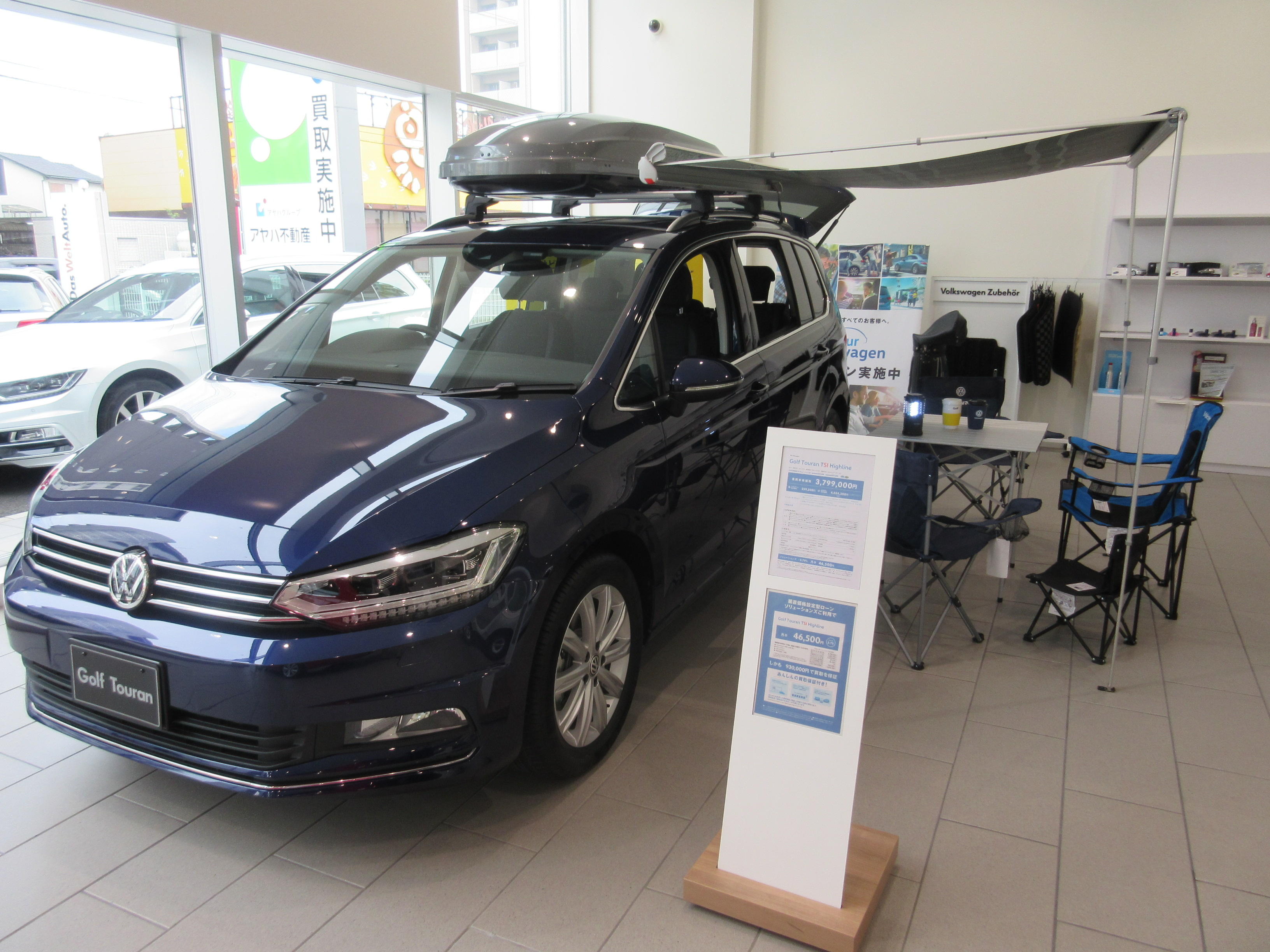 ショールームにはGolf Touranでの展示をしておりますが、ルーフレールの付いたお車であれば装着が可能です