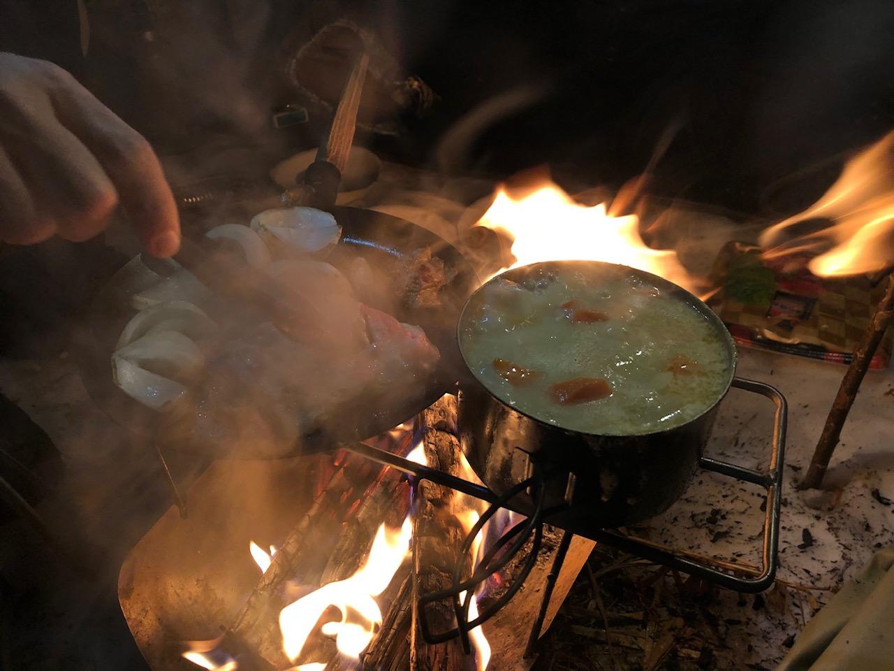 焚き火の下は乾いてるけど、そこ以外は真っ白け。 シチューであったまる。 この日はビールより焼酎お湯割り。