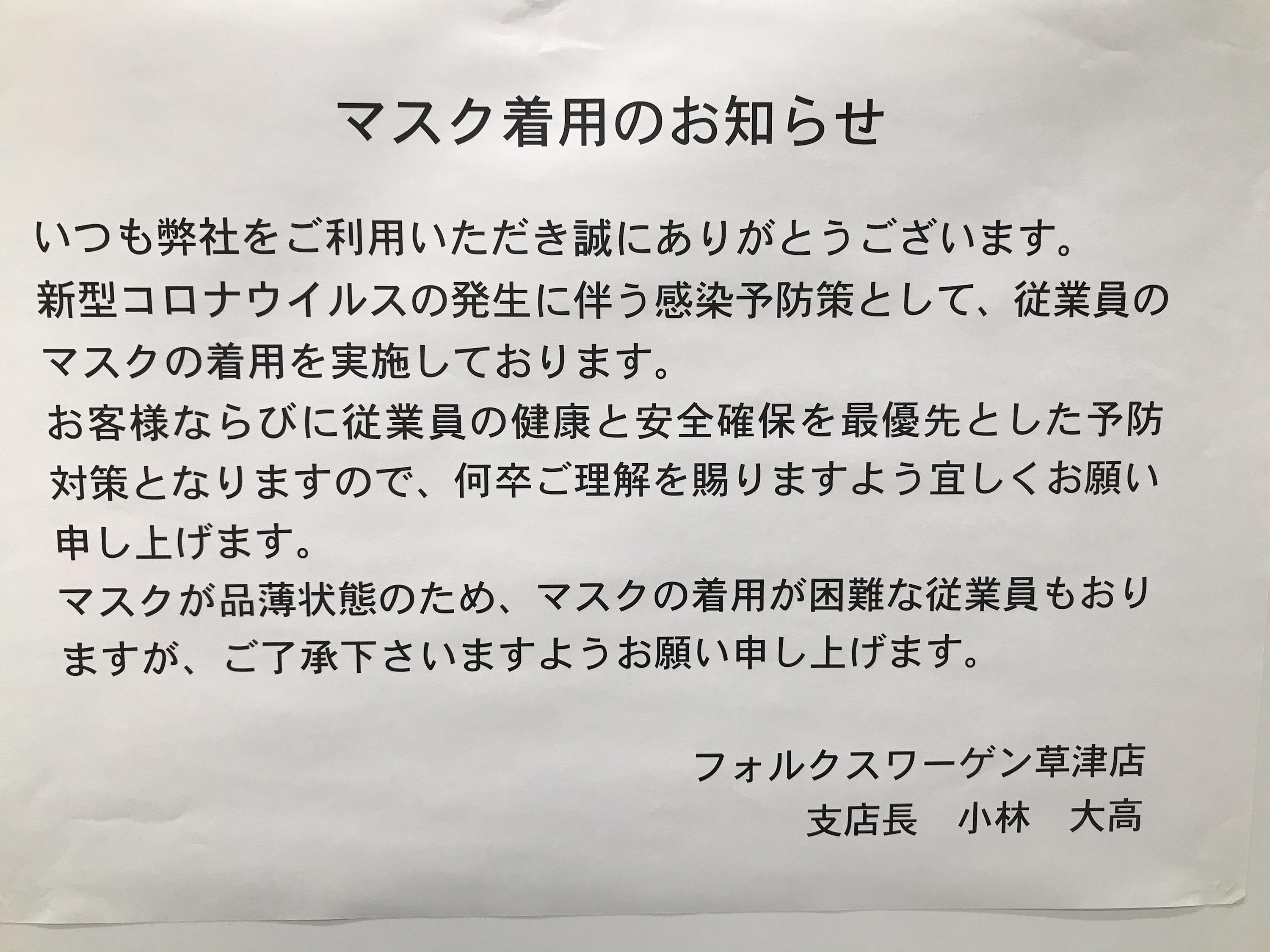 フォルクスワーゲン草津は、新型コロナウィルス対応のため、「同乗試乗」「新車フェア」等を停止しておりますが、「定休日」「営業時間」に変更はございません。