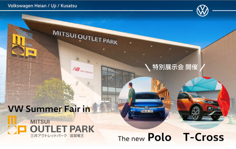 展示会のお知らせです VW Summer Fair in 三井アウトレットパーク滋賀竜王 南モール1階 センターコート特設会場 特別テナントショップを出店致します。(8日?10日は車両展示のみ) The New POLO他の展示やVW情報をご用意してお待ちいたしております。