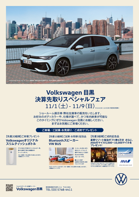 皆様こんにちは いよいよ11月に突入しましたね すっかり朝も冬を感じる寒さになってきました・・ 寒いのは苦手ですが 冬は楽しいイベントもたくさんあるので ワクワクします そして楽しいイベントの一つに!! Vokkswagen 目黒  **決算先取りスペシャルフェア** 11月1(土)‐11月9(日)迄 本日より開催中でございます!! *・*・*・*・*・*・*・*・*・*・*・*・*・*・*・*・*・*・*・*・*・*・*・*・*・*・*・*・*・*・* ショールーム展示車・弊社在庫車の販売をいたします。 お好みのボディカラーや、仕様が選べて、かつ年内納車が可能な このタイミングにぜひVolkswagen目黒にお越しください。 まずはお気軽にご来場ください。 そしてご来場・ご試乗・お見積り・ご成約で それぞれ素敵なプレゼントをご用意しております 三連休スタートしましたので ぜひこの機会に遊びに来て下さい 皆様のご来場を心よりお待ちしております 最後までご覧いただきありがとうございます フォルクスワーゲン目黒CAでした 東京都目黒区中央町1-5-6  03-5768-4411 10:00-18:00 毎週 火・水曜日定休