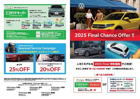 三連休はいかがお過ごしでしょうか 早いもので今年もあとわずかとなりました フォルクスワーゲン美浜店では 12月末までのお得なキャンペーン " 2025 Final Chance Offer " を 実施中です!! ショールームはXmasツリーや デジタルツールで 少し雰囲気が変わっております ぜひお立ち寄りください