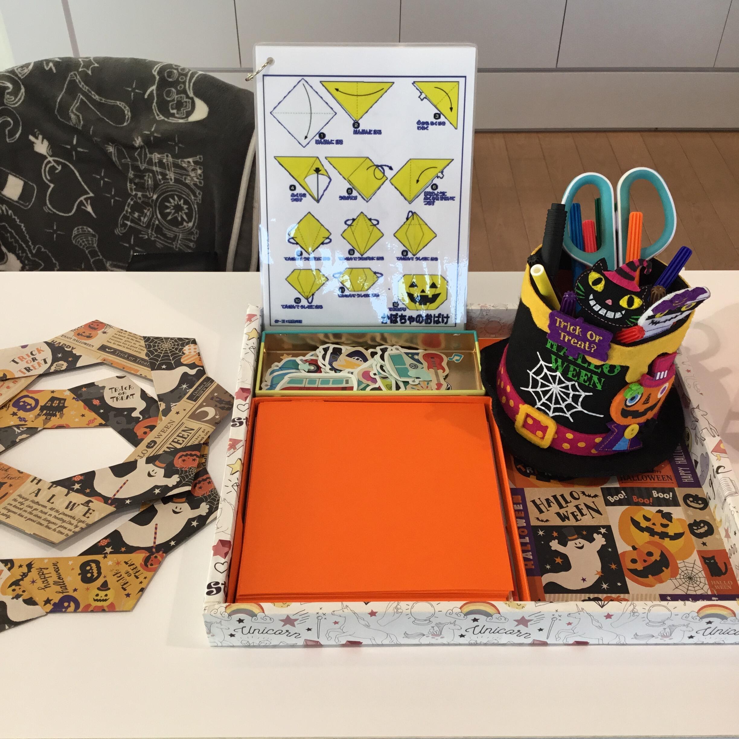 折り紙でハロウィンの飾りを作っていただき、リースに飾りつけしていただきます