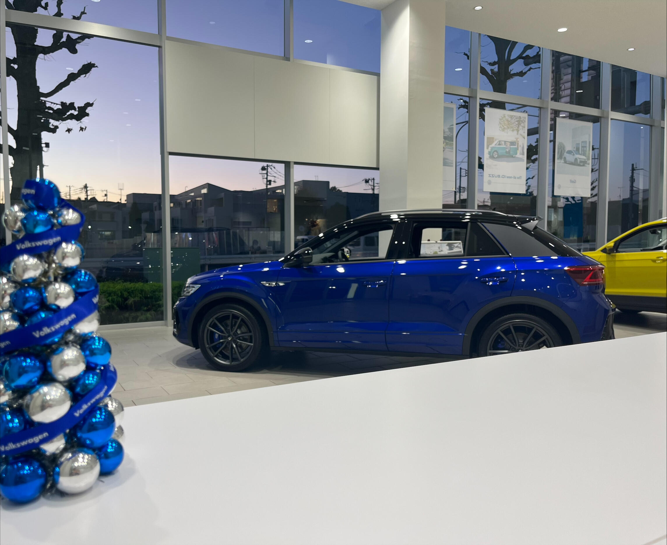 普段私の居ります受付近くでは、ブルーのミニクリスマスツリーがT-Roc Rのブルーと、とても綺麗に見えるんです
