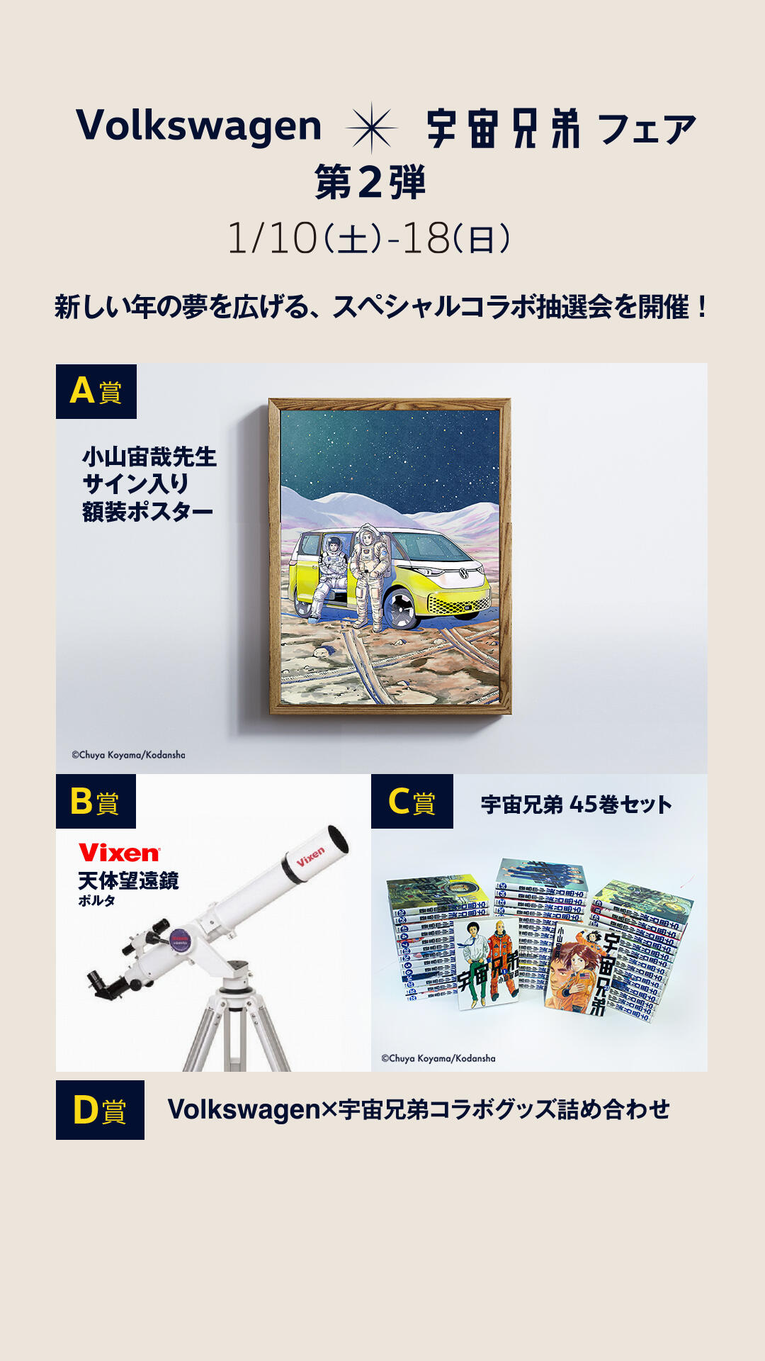 2026年にいよいよクライマックスを迎える『宇宙兄弟』。フォルクスワーゲンはこの国民的漫画とコラボレーションして、今年初のフェアを開催します🎊