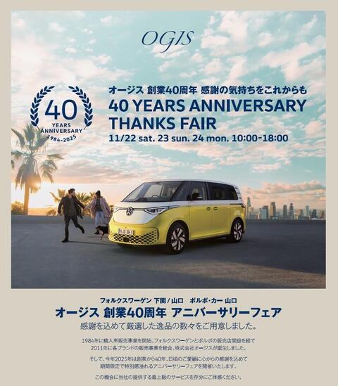 弊社株式会社オージス、創業40周年、日頃のご愛顧に感謝の気持ちを込めて11月22日(土)23(火)24(月)の3日間 アニバーサリーフェアを開催致します♪40周年記念特別サポート付き限定車もご用意致しました!アニバーサリーフェア期間中にご成約頂いたお客様に特別なプレゼントもございます(^_-)-☆そして!これからの時期を快適に過ごして頂く為のサービスメニューも10%OFFにてご提供致します!!スタッフ一同皆様のご来店を心よりお待ちしております(^^)/