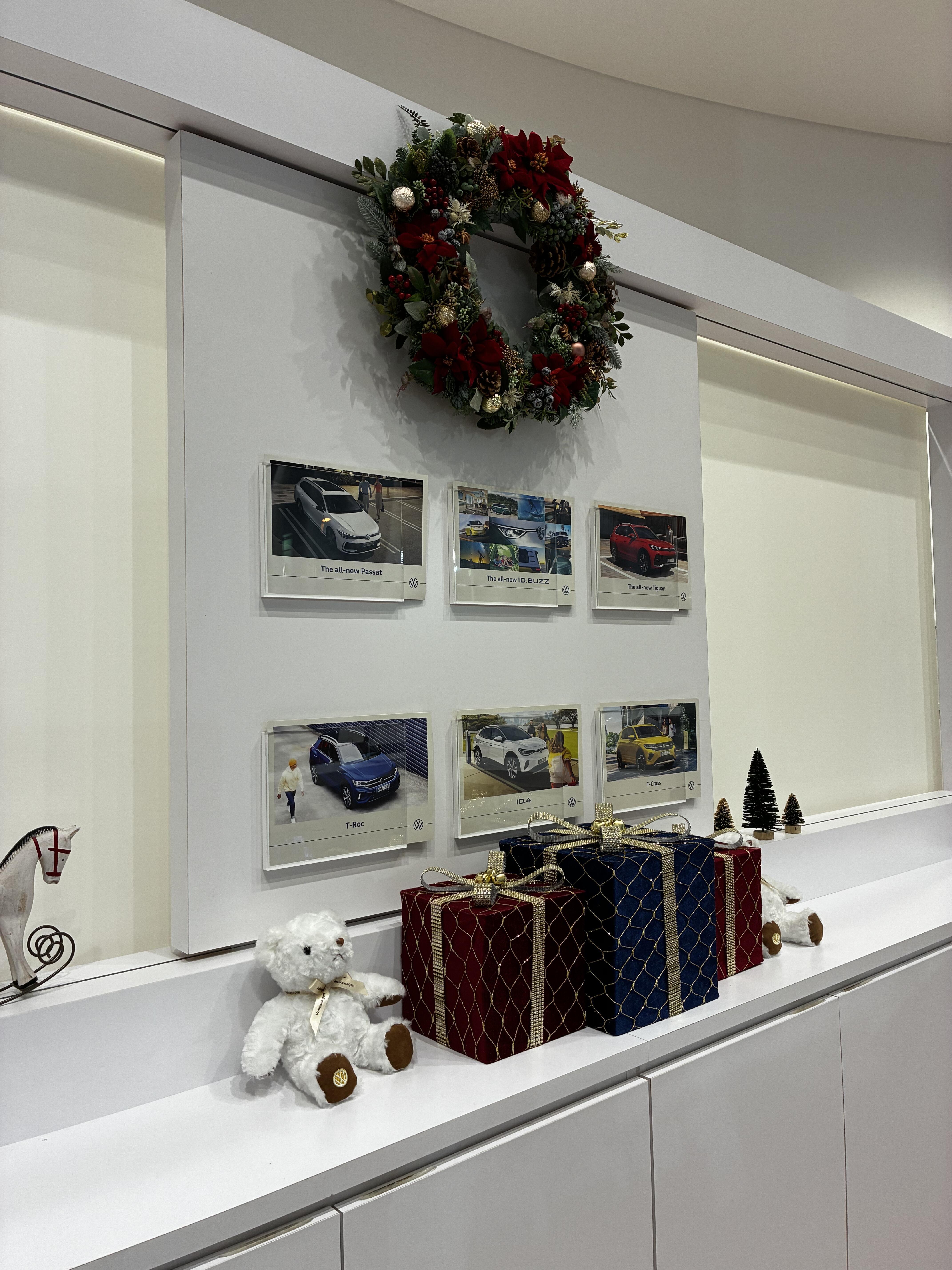 ショールームのあちらこちらにツリーやオーナメント、キラキラと光るイルミネーションを飾りつけ、