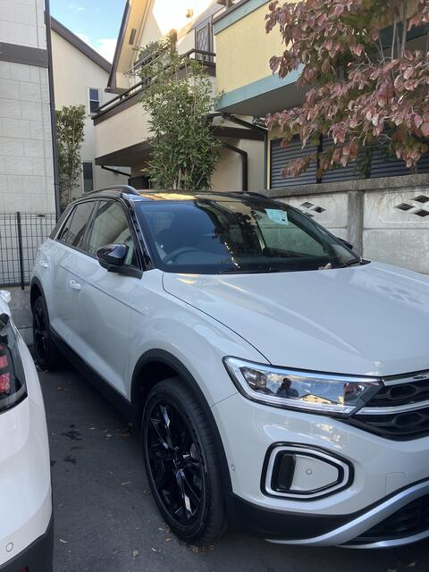 T-ROCのアスコットグレーBlackStyleです アスコのブラスタと呼んでる人は一人もいないので注意して下さい。 アスコットグレーの色が写真ではどうしても分かりにくいので 手前にピュアホワイトのT-CROSSを見切れさせた 技術力の高い一枚です