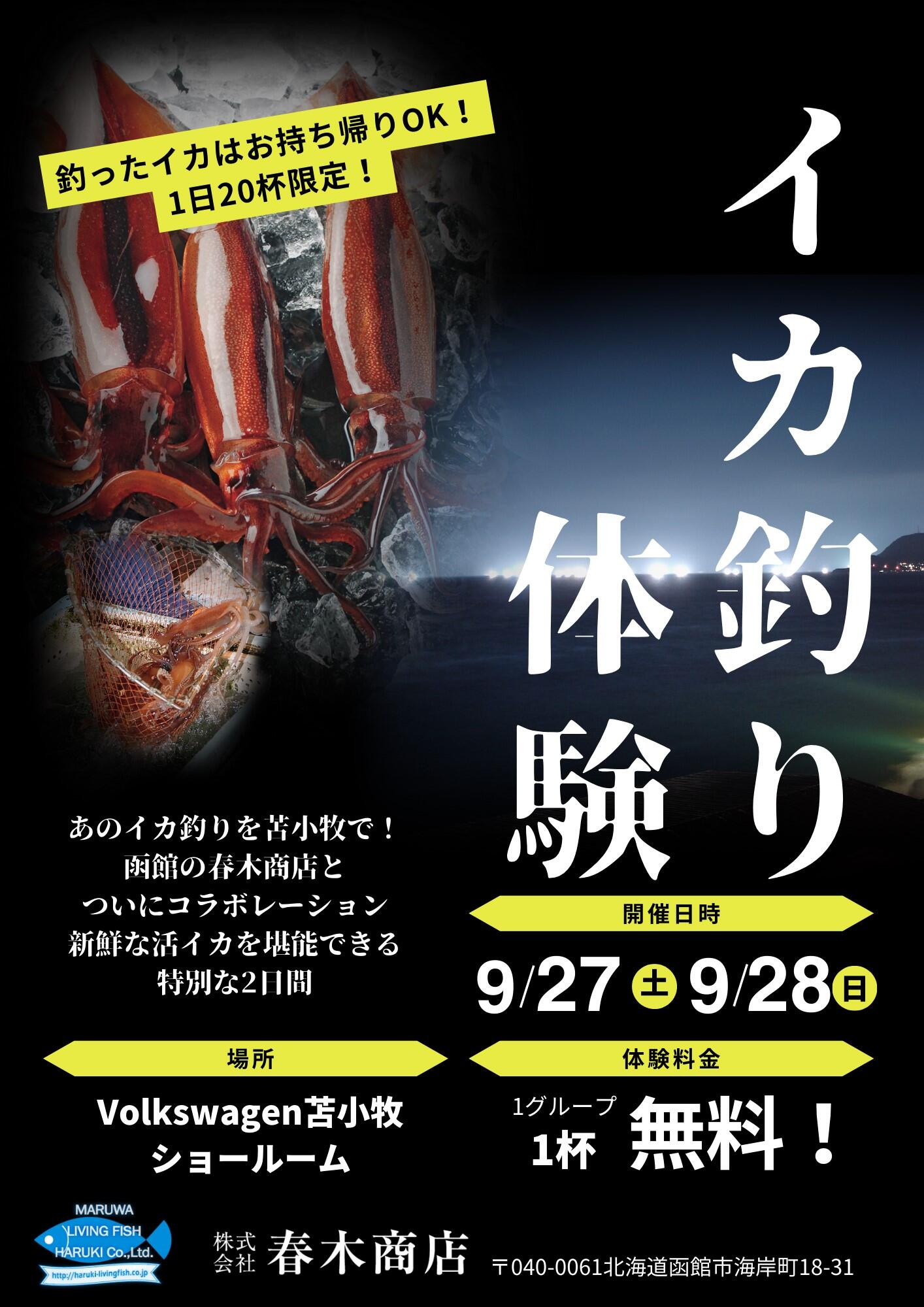 Volkswagen苫小牧ショールームにて『イカ釣り体験』を開催いたします1日20杯限定でご用意しております新鮮な活イカ、体験料金は無料ですこの機会に是非、お立ち寄りくださいませ!皆様のご来店、スタッフ一同心よりお待ちしております