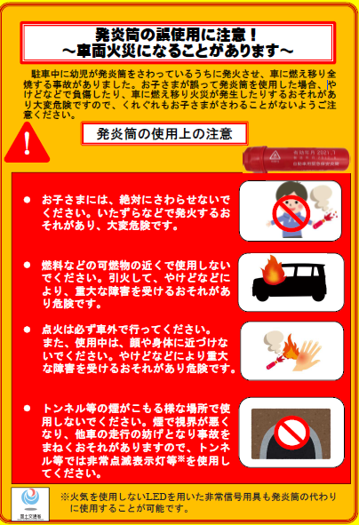 児童が誤って発炎筒を発火させてしまい、車輛火災が発生する事故が今年の初めにありました。