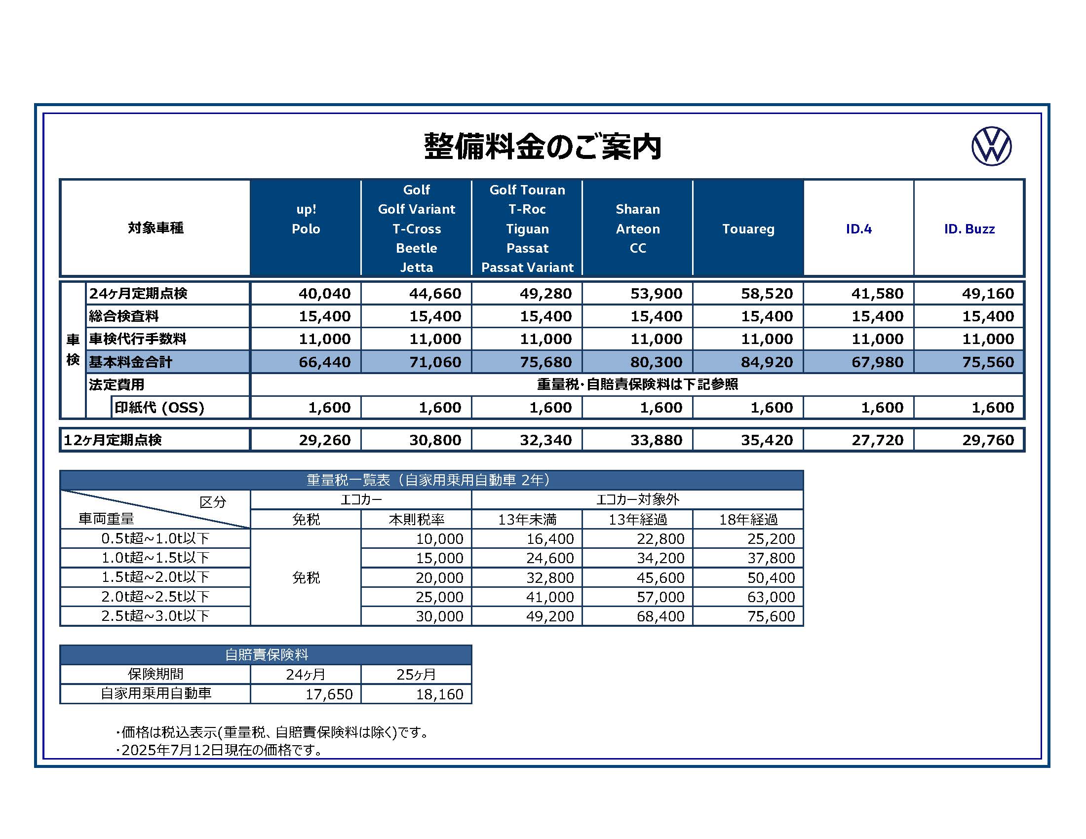 整備料金のご案内