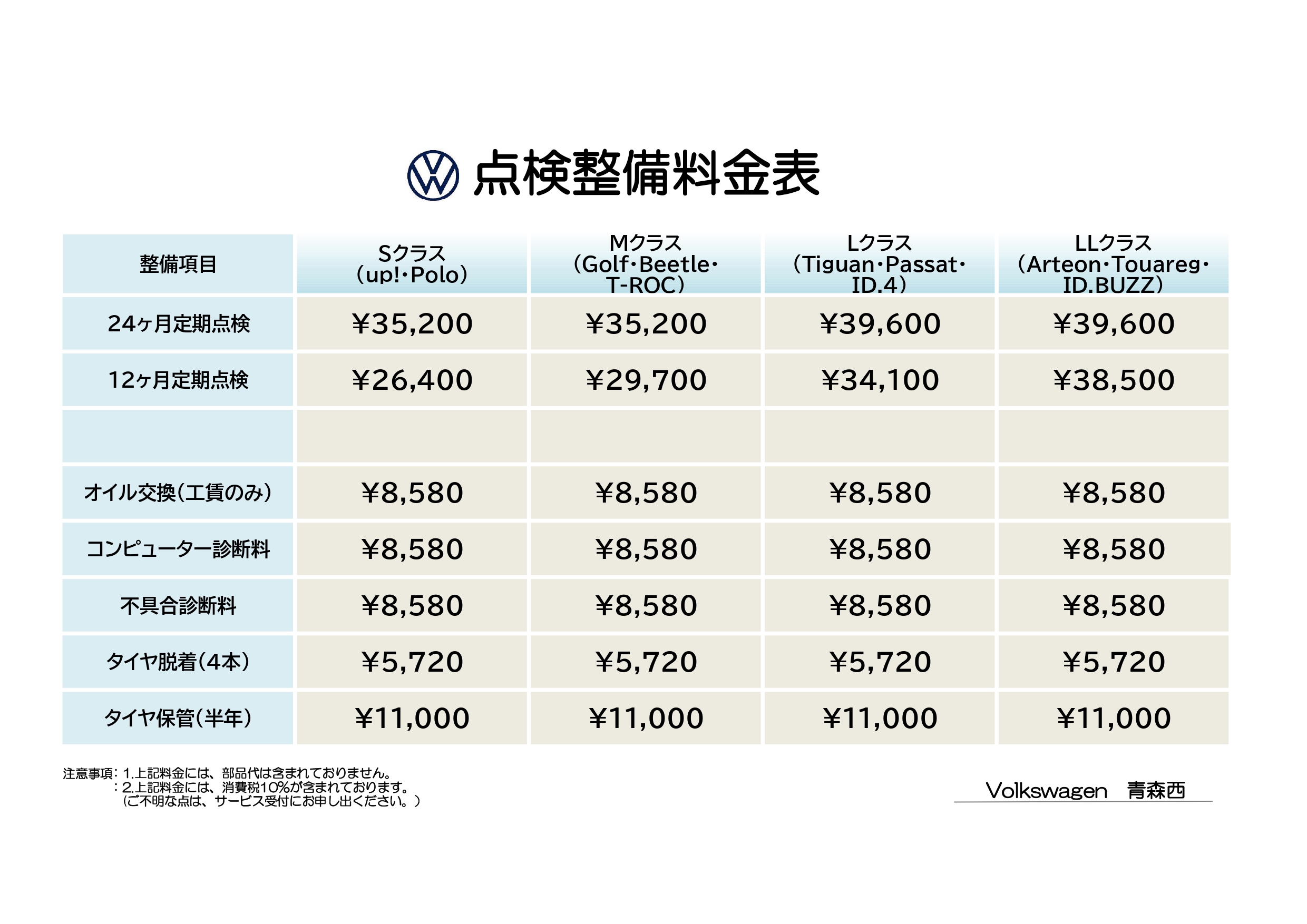 フォルクスワゲーン青森西の点検・車検料金表のご案内です。