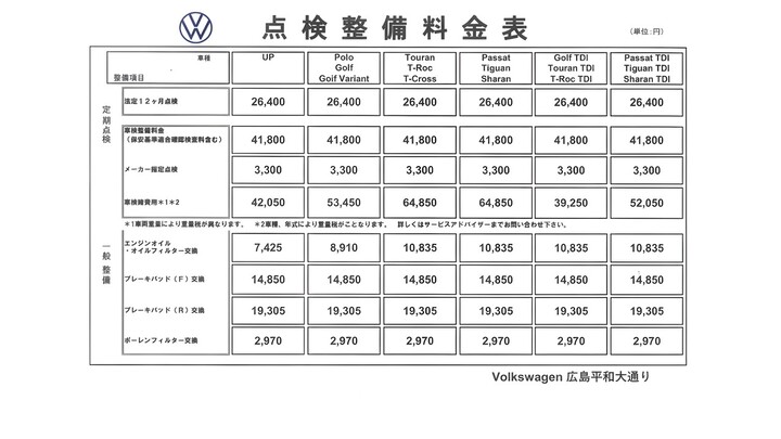 ※点検整備料金表の料金には消費税が含まれております。